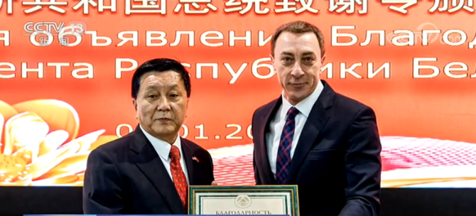 中国公民成为首位获颁白俄罗斯总统感谢状的外国人