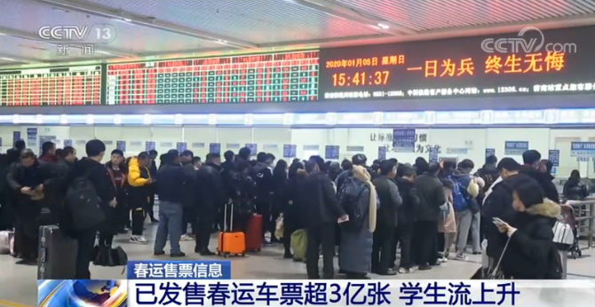 昨天(5日)铁路互联网和电话售票开始发售春运第25天,也就是2月3日(正月初十)的火车票。春运首日车票开始发售至今,全国铁路已经发售春运期间车票3亿多张。随着各地大学生陆续放假,学生客流也开始上升。