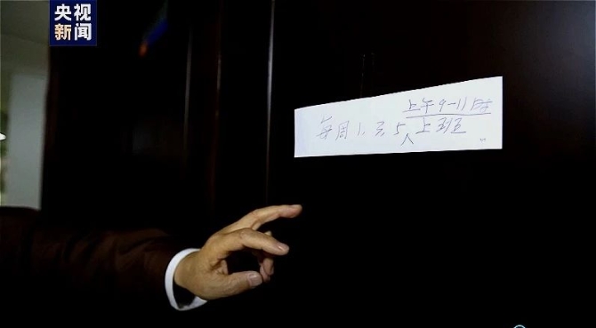 他为了怕来这找他的人到这里找不到他,因为这楼里的人也少了。他就贴了个条,说每周一、三、五上午九点到十一点上班。来看他的人一看就知道,还有搞卫生和保洁的人,不用给他倒开水了。他自己写的这个条。