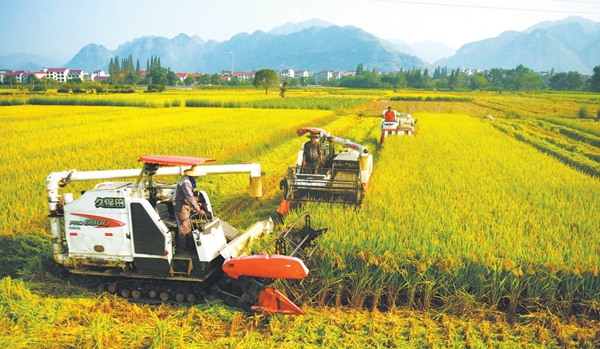 2019年10月10日,浙江省武义县晓辉家庭农场主方晓辉出动3台大型联合收割机收割单季稻。 张建成摄(中经视觉)