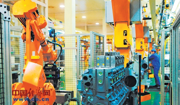 潍柴二号工厂总装车间,机器人正在装配发动机缸盖总成部件。 经济日报-中国经济网记者 黄鑫摄
