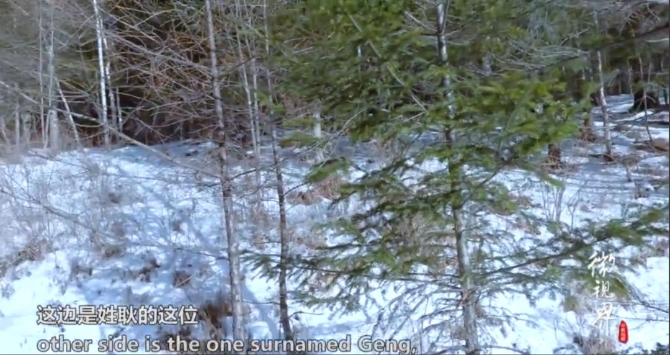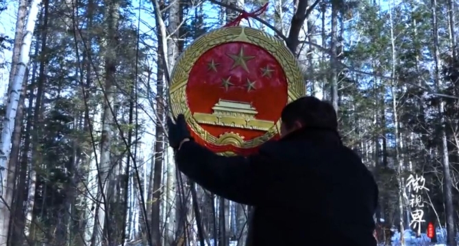 树林中挂起国徽由于双方争执的红松果林界线在山上,越野车无法驶进去,张祖祥一行人只能下车爬山。山里人迹罕至,积雪无人清理,早已完全把山路覆盖住,一脚踩下去,白雪没过小腿的一半。经过艰难的行走,张祖祥一行人到了争议地。