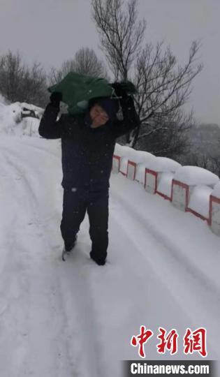 李建兵扛着试卷包,和同行的女教师开始行进在覆盖厚厚积雪的山道中。没一会,女教师扛不住,找了根木棍当拐杖。而他则一直坚持自己扛着试卷包。累了休息会,但他始终将试卷包紧紧地抱在怀中。