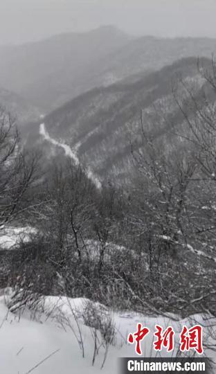 视频中,在前往山西省晋中市昔阳县西寨乡的“十三盘”山道上,一位男老师肩扛一大袋试题包,一位女老师左手拄着拐杖,右手提着一小袋试卷艰难行走在雪路中。