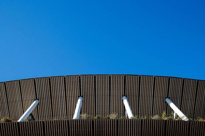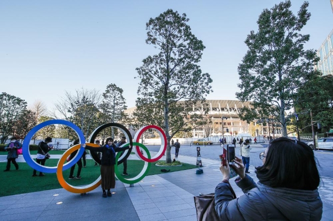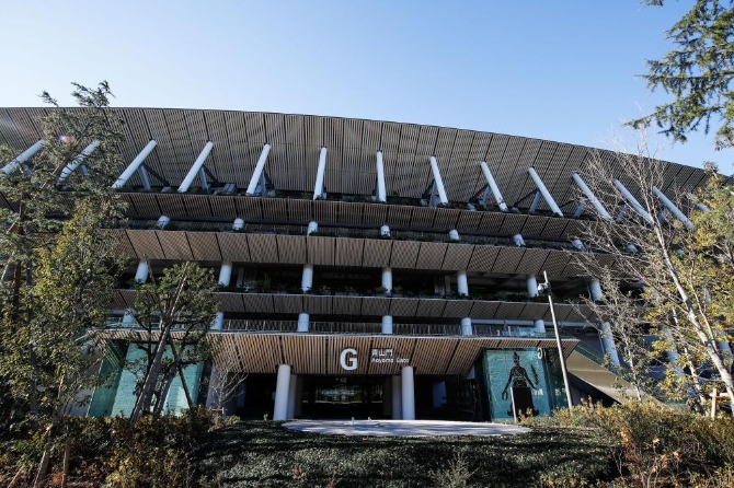 日本东京,2020东京奥运会新国立竞技场外景一览。新国立竞技场于上个月竣工,作为东京奥运会主场馆,将是2020东京奥运会及残奥会的开闭幕式举办地,不少游客到此处拍照留念。