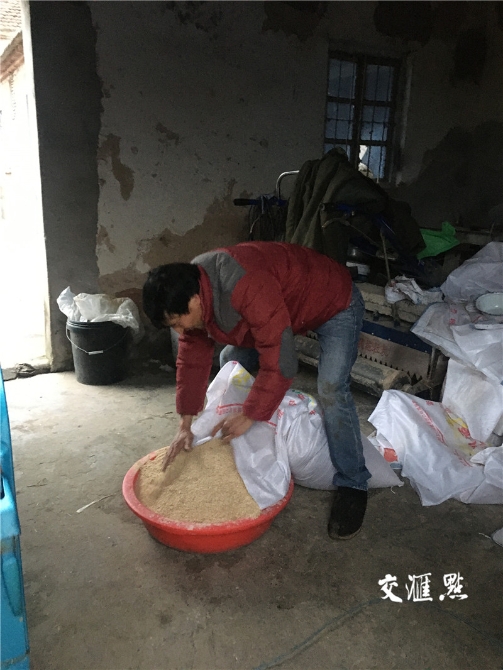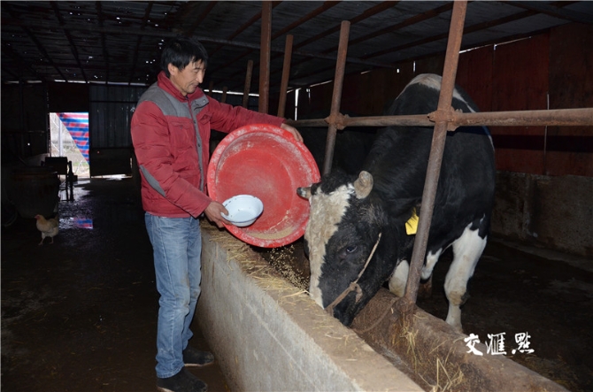 看张其全喂牛还真让人有种享受感,整个喂牛过程一丝不苟,一点不马虎。先给每头牛喂一小把草料。“牛吃草,但不是吃得越多越好,吃多了会出现气胀。”随后,他开始配制混合饲料,铲些酒糟放进两口缸内,并加入麦麸、小苏打、盐、水等,搅拌几分钟,便做好了,一桶一桶地倒到每头牛的槽子中,“小牛两桶左右,大牛三至四桶,每天两顿,早上7点,下午3点。”也许是张其全做的这种食物太美味,牛吃着还不时用舌头舔着唇,似乎在表达赞许。等牛差不多享用完这些美食了,张其全又用塑料桶端来颗粒饲料,每头牛跟前一小铲,“颗粒饲料也不能吃多,吃多了食胀,所以喂牛的各种饲料都必须定量,否则就可能生病”。
