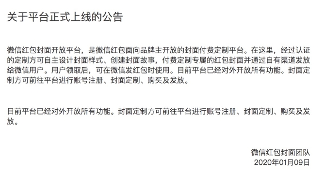 “春节即将到来,我们在红包上也有一些新的创造,可能也会吸引你来发挥你的创造力,这里也预告一下。”在“微信之父”张小龙在2020微信公开课PRO上透露春节微信红包新玩法后不久,微信就揭晓了悬念,这个"新的创造"指的是——红包封面。