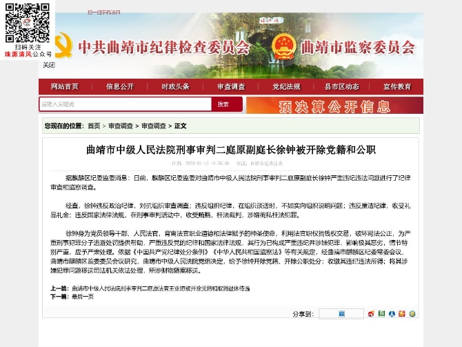 徐钟身为党员领导干部、人民法官,背离法官职业道德和法律赋予的神圣使命,利用法官职权搞钱权交易,破坏司法公正,为严重刑事犯罪分子逃避处罚提供帮助,严重违反党的纪律和国家法律法规,其行为已构成严重违纪并涉嫌犯罪,影响极其恶劣,情节特别严重,应予严肃处理。依据《中国共产党纪律处分条例》《中华人民共和国监察法》等有关规定,经曲靖市麒麟区纪委常委会议、曲靖市麒麟区监委委员会议研究,曲靖市中级人民法院党组决定,给予徐钟开除党籍、开除公职处分;收缴其违纪违法所得;将其涉嫌犯罪问题移送司法机关依法处理,所涉财物随案移送。(本文由昆明信息港写稿机器人小明根据曲靖市纪委网站数据自动合成发布)