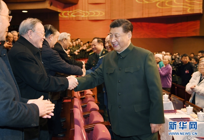 下午4时许,习近平来到老同志中间,全场响起热烈掌声。习近平同大家亲切握手,关切询问他们的身体和生活情况,共同回顾过去一年党、国家、军队事业取得的重大成就。老同志们一致表示,要更加紧密地团结在以习近平同志为核心的党中央周围,以习近平新时代中国特色社会主义思想为指导,贯彻习近平强军思想,贯彻新时代军事战略方针,坚持政治建军、改革强军、科技强军、人才强军、依法治军,不忘初心、牢记使命,锐意进取、开拓创新,为实现国防和军队建设2020年目标任务,为夺取全面建成小康社会伟大胜利作出新的贡献。
