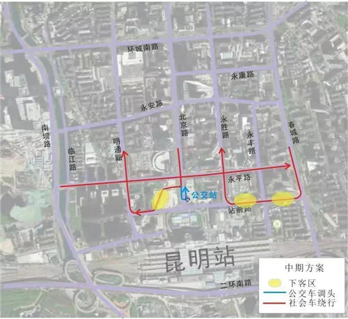 通过北京路与环城南路口左转,经环城南路、春城路、站前路到达昆明站核心区域,并可在站前路快速上下乘客后由永胜路向北驶离昆明站片区。