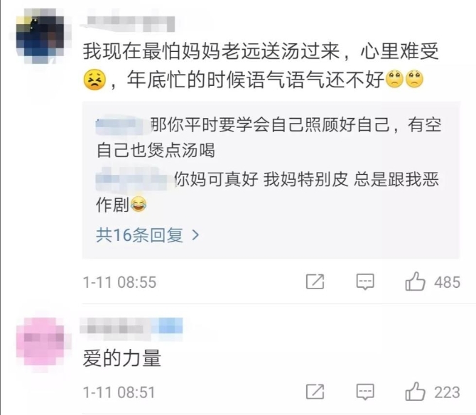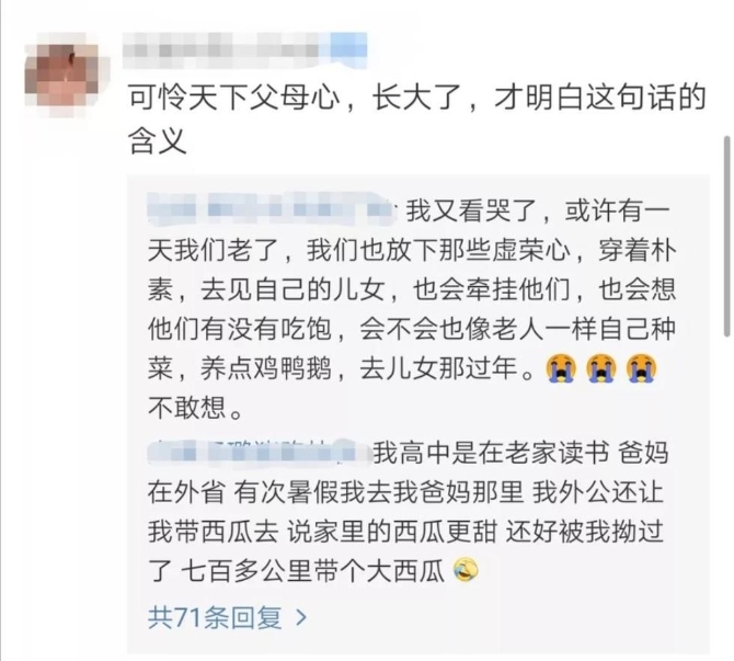 网友们感叹:”看哭了,想家“、" 可怜天下父母心"、“总想给晚辈最好的”、“没事常回家看看,别让父母过年再长途跋涉。”