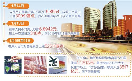 近期人民币汇率表现抢眼。来自中国外汇交易中心的数据显示,1月13日至16日人民币对美元汇率中间价连续4日上调;其中,14日人民币对美元汇率中间价报6.8954,较前一交易日上调309个基点,创2019年6月21日以来最大升幅,并创2019年8月1日以来新高。