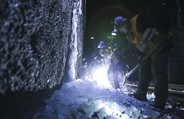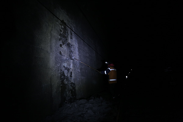 展开维修工作时,西罗奇工队的10名职工,有的头戴照明灯,有的携带大型射灯,在防护员的保护下四处搜寻隧道内的积冰。西罗奇工队工长王龙发现一片长2米左右,宽约50厘米的地面积冰,立即组织职工们用大头镐清理。他们两人一组轮流作业,每人迅速地刨了五六十下,十多分钟后,这处积冰就被大家清理干净。