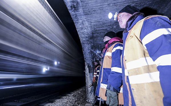 “工具拿好,注意点脚下,这趟车过去了就往工队走。”王龙组织大家收拾工具,在隧道避车洞内提前做好避车准备。