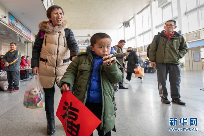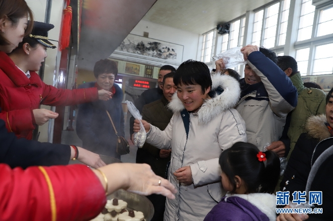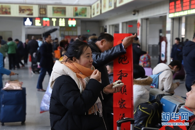 旅客吃着“枣糕”,拿着“福”字满满幸福感