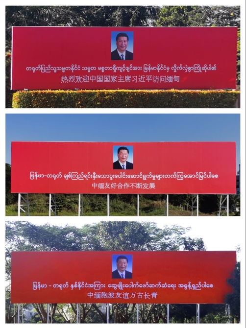 从机场前往市区途中,多处可见“中缅胞波友谊万古长青”等字样的横幅和巨型标语。