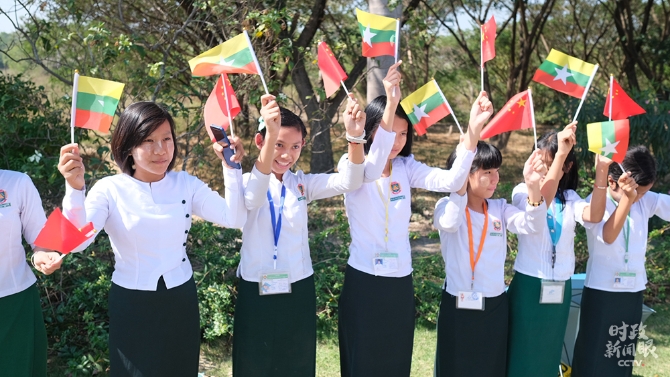 △缅甸青少年挥动中缅两国国旗,用缅文欢呼“中缅友谊万岁”。(总台国广记者李晋拍摄)