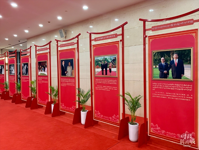 △仪式开始前,习近平在缅方领导人陪同下,观看了庆祝中缅建交70周年图片展。(总台央视记者石丞拍摄)