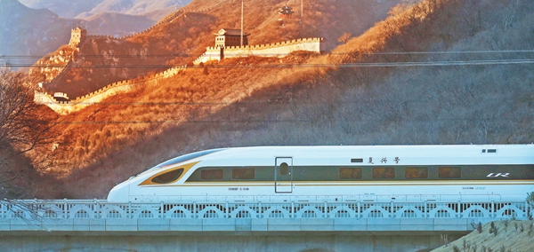 2019年12月30日,一辆复兴号智能动车组在北京居庸关长城下一闪而过。 雷 声摄(中经视觉)