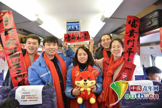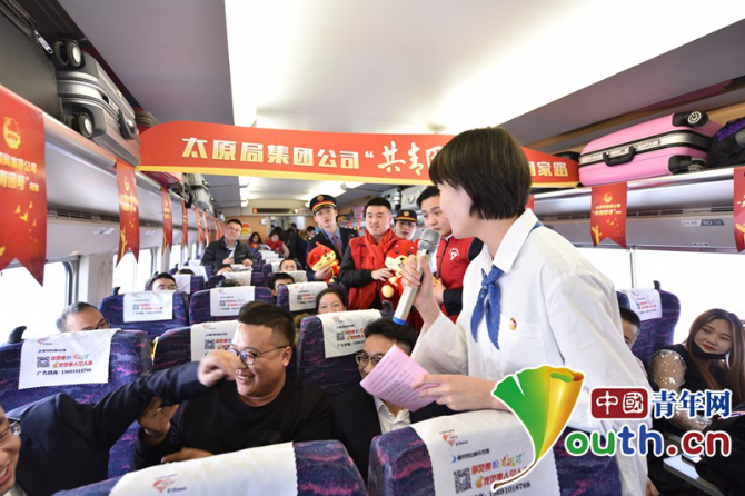 中国青年网北京1月19日电 (记者宋静 通讯员 吕宇飞)“你们的服务太贴心周到了,在这群年轻人身上我看到了青春的活力,真好!”1月17日,农历腊月二十三,中国铁路太原局集团有限公司“共青团号”D5368次列车从太原南站始发开往大同南站,返乡过年的刘女士拿着参与活动的奖品春联对列车的服务频频点赞。