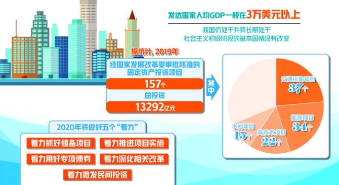 2019年,我国一些重大领域项目投资取得了良好进展。据统计,2019年全年经国家发展改革委审批核准的固定资产投资项目157个,总投资13292亿元。