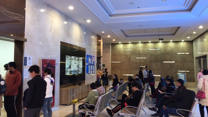 在昆明华山眼科医院一楼视光中心,许多家长和孩子在等候检查。
