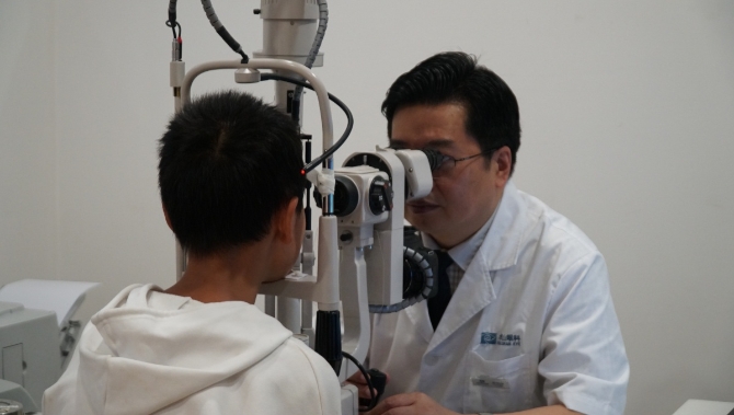 华山眼科医疗集团副总院长谢伯林教授为青少年检查视力。
