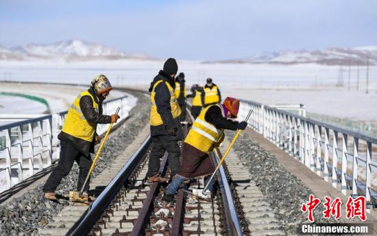 航拍安多车间工作人员检查轨道设备情况。在这里坚守的数十名工作人员负责辖区36公里的青藏铁路线路维护任务,他们守护在“生命禁区”的“天路”两旁,保障每一列穿行于“世界屋脊”的列车安全运行。(中新社记者 何蓬磊 摄)