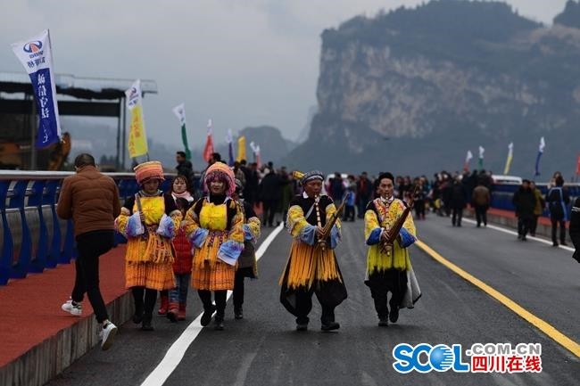 田坝村的苗族村民们,穿上民族服装,吹着苗族特色的芦笙,庆贺这一“几辈人都盼望的事成真。”田坝村村主任王思才说,桥通了,村里的核桃就能通过公路运到对岸,卖上好价钱。