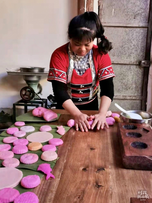 △李发顺一家正在制作节日传统食品大米粑粑。(总台央视记者史伟、央广记者马喆拍摄)