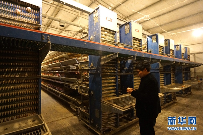 中华村嘉多喜蛋鸡养殖股份合作社,采用了自动集蛋设备,自动化程度高。新华网发(刘柳吟 摄)