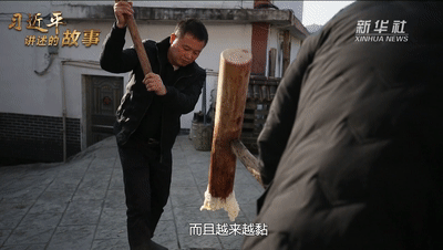 刚蒸熟的糯米倒入石臼,用木槌反复地击打,直到它的质地变得细腻柔软,而且越来越黏。像这样一锤接一锤,打出的是浓浓的年味!2016年春节前夕,习近平总书记在江西省井冈山市神山村考察时,就与当地村民一起打糍粑,互致新春祝福。