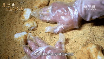 打好的糍粑揉搓成小团,在黄豆粉还有白砂糖芝麻里面滚上几圈,吃上一小块,甜糯爽滑,为新一年讨一个好彩头,吉祥应景。