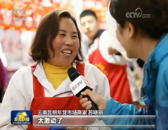 云南昆明年货市场商家 苏晓丽:太激动了。现在的生活甜蜜,希望能把生意做得越来越红火,把以前传统的味道都做出来。