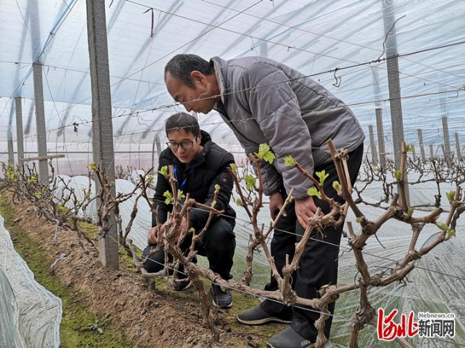 “别着急,一会儿就到!”赵见行嘴里塞着半拉馒头,边穿棉袄边不停地答应着。约半小时后,赵见行已经钻进了饶阳镇北关村葡萄种植户王占岭的葡萄棚。