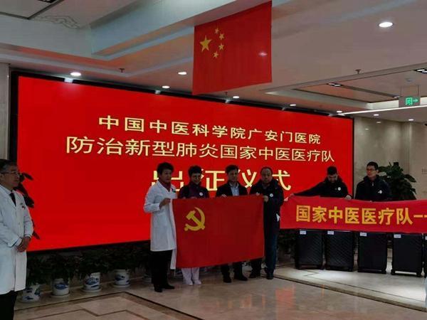在中国中医科学院广安门中医院的出征仪式上,鲜艳的党旗格外醒目。