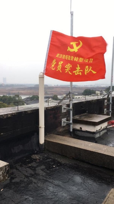 此时的武汉火神山热火朝天的建设现场,党员突击队、党团突击队、党员先锋队的旗帜高高飘扬。