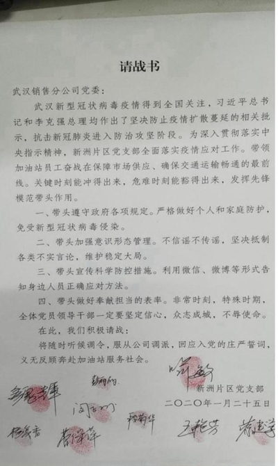 在保障市场供应、确保交通运输畅通的最前线,中石油武汉分公司党委募集党员志愿服务者,随时听候调令,服从公司调派,赴加油站服务。