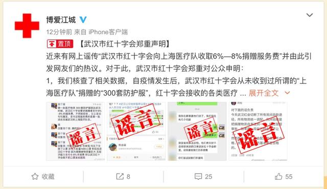 武汉市红十字会呼吁广大网友,不要让谣言玷污了各界爱心企业和爱心人士的善意之举,疫情面前,不信谣、不传谣,众志成城,共渡难关。