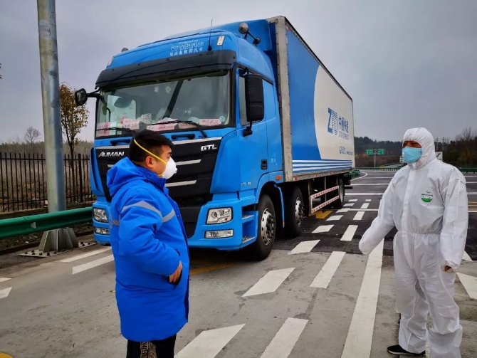 1月27日上午8时许,载有2273套防护服、1235副护目镜以及13932只防护口罩的中通货车抵达湖北省赤壁市同济蒲纺医院 。这些都是赤壁市抗击新型冠状病毒肺炎所亟需的物资。