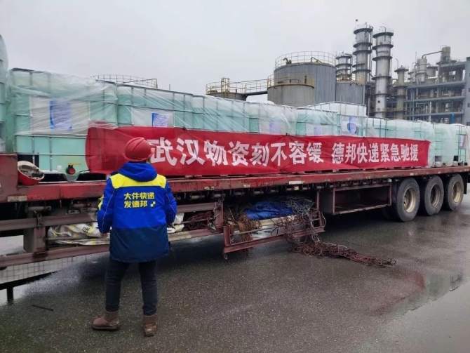 1月27日,德邦快递免费运输30吨消毒水物资由滁州市来安县前往武汉。