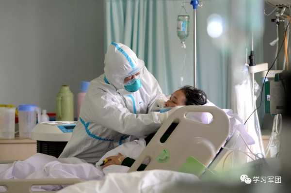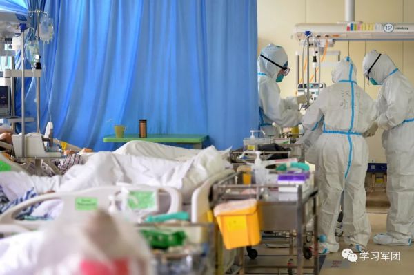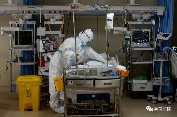 1月27日上午,海军军医大学医疗队医护人员在汉口医院重症监护室对新型冠状病毒感染的肺炎患者进行救治。医护人员精心护理患者。解放军报 记者范显海/摄