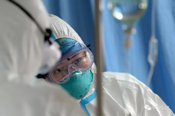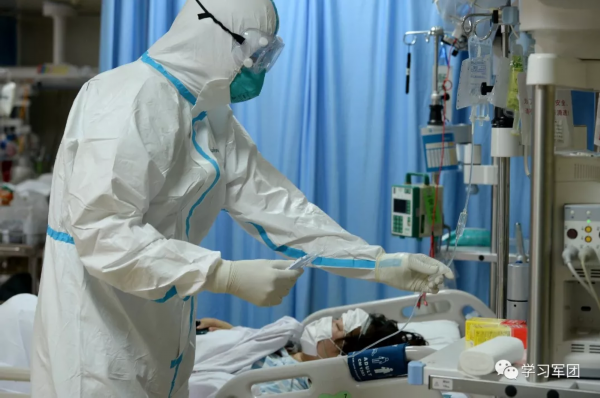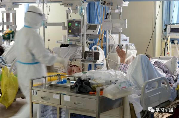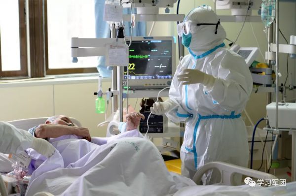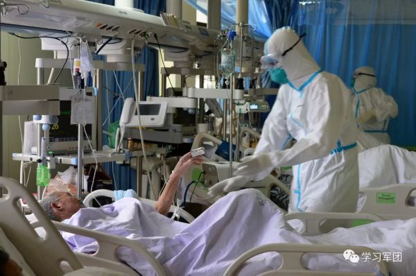 1月27日上午,海军军医大学医疗队医护人员在汉口医院重症监护室对新型冠状病毒感染的肺炎患者进行救治。医护人员加强巡视,观察输液滴数。解放军报 记者范显海/摄