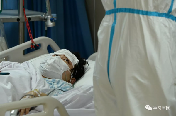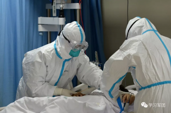 1月27日上午,海军军医大学医疗队医护人员在汉口医院重症监护室对新型冠状病毒感染的肺炎患者进行救治。在患者眼中,医护人员就是他们的“救星”。解放军报 记者范显海/摄