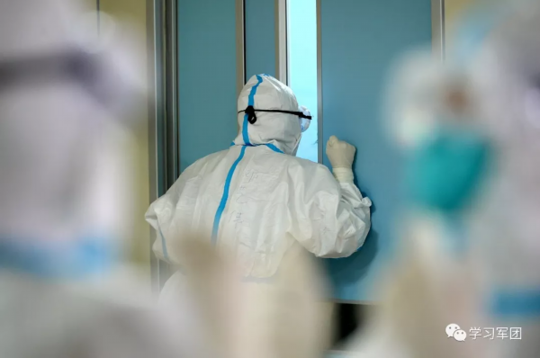 1月27日上午,海军军医大学医疗队医护人员在汉口医院重症监护室对新型冠状病毒感染的肺炎患者进行救治。医护人员与监护室外人员隔门交流。解放军报 记者范显海/摄