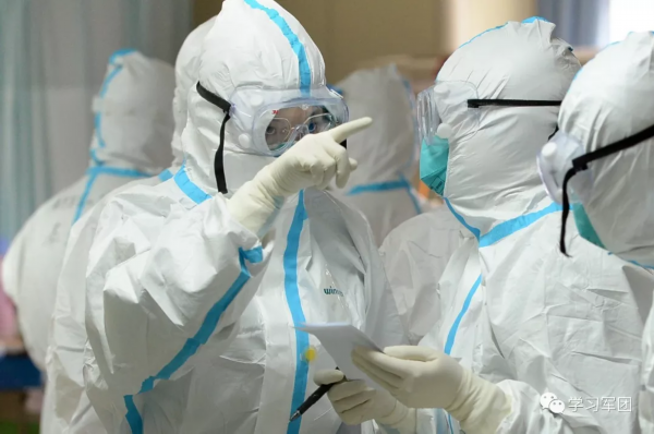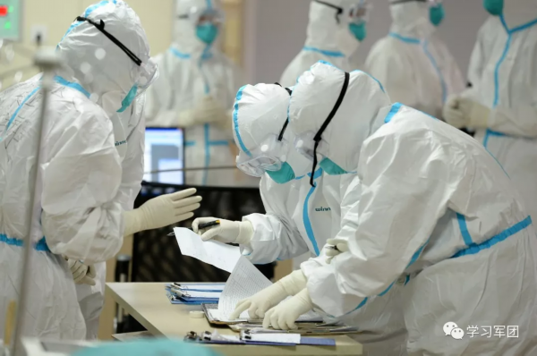 1月27日上午,海军军医大学医疗队医护人员在汉口医院重症监护室对新型冠状病毒感染的肺炎患者进行救治。医护人员研究重症患者治疗方案。解放军报 记者范显海/摄