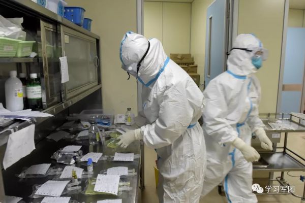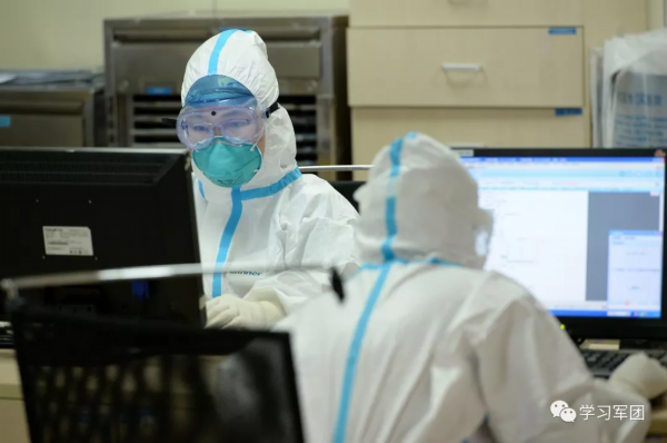 1月27日上午,海军军医大学医疗队医护人员在汉口医院重症监护室对新型冠状病毒感染的肺炎患者进行救治。医护人员查看检查结果,评估患者病情。解放军报 记者范显海/摄