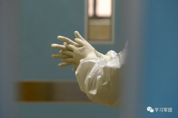 1月27日上午,海军军医大学医疗队医护人员在汉口医院重症监护室对新型冠状病毒感染的肺炎患者进行救治。穿好防护服的医护人员在进入重症监护室前洗手消毒。解放军报 记者范显海/摄