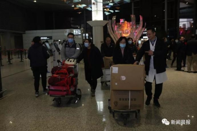 24日晚上,首批上海医疗队136人在上海虹桥机场集结,搭乘飞机前往武汉。
