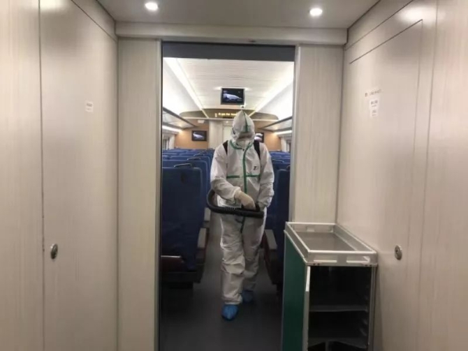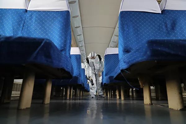 喝了一杯冲剂,重新换上防护服,樊杨带着防疫人员对动车组的餐车、司机室、监控室、广播室等重要场所进行消毒,动车组车厢两端连接处、行李架等也认真喷洒到边边角角。
